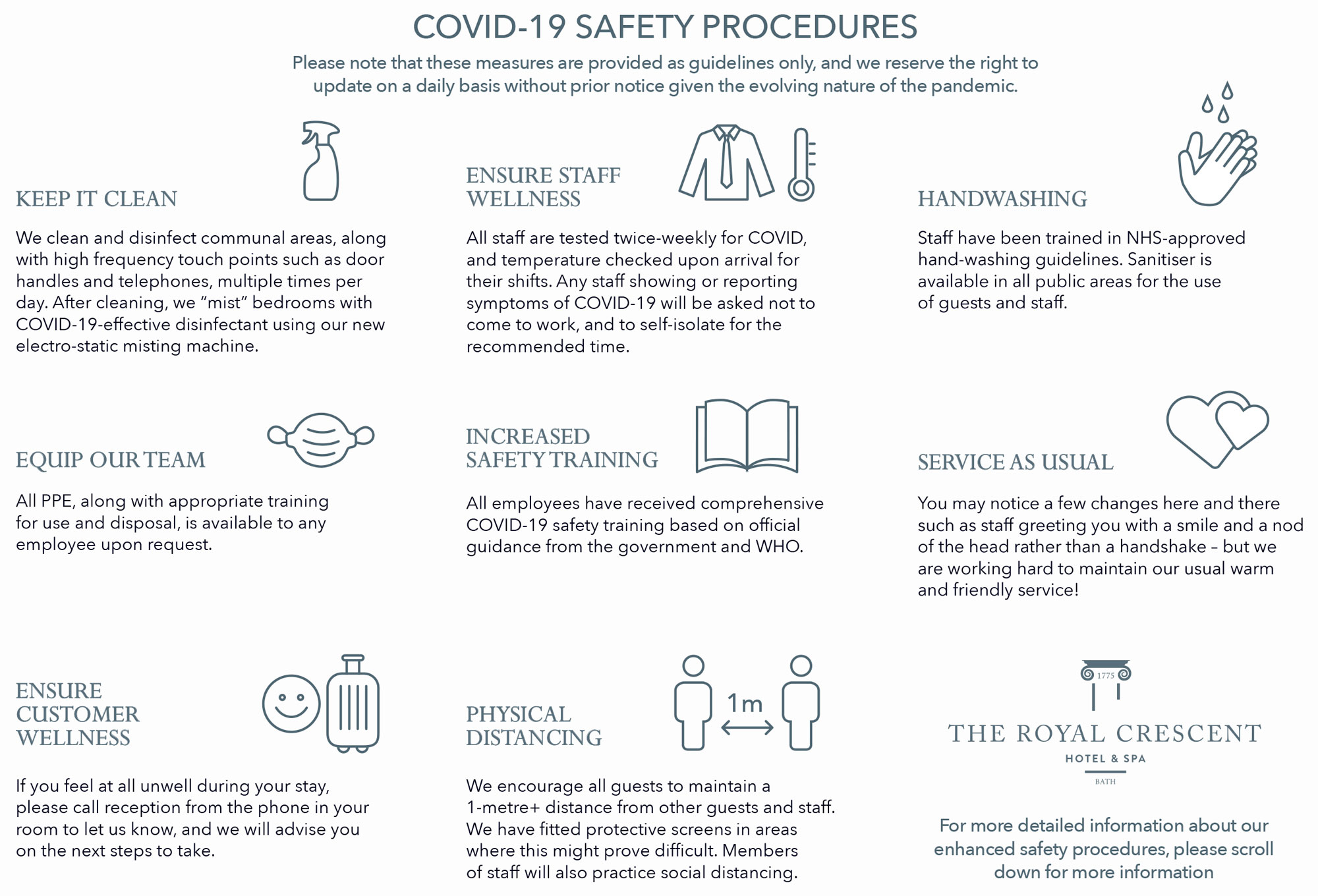 We have developed these new enhanced procedures in accordance with a combination of the WHO guidelines, UK Hospitality recommendations and Government advice, to ensure that we are not only compliant, but going above and beyond to protect and reassure our guests and staff. We have also undertaken a full risk assessment, outlining in detail how we are meeting these guidelines in every area of our hotel. These are being communicated to staff by managers first through initial training and then on a regular basis.